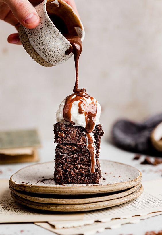 + Bước 7: Dùng thìa gỗ phết kem lên phần bánh brownie đã để nguội rồi đặt phần bánh còn lại lên trên. Rây một ít đường bột lên trên mặt bánh để trông ấn tượng hơn.