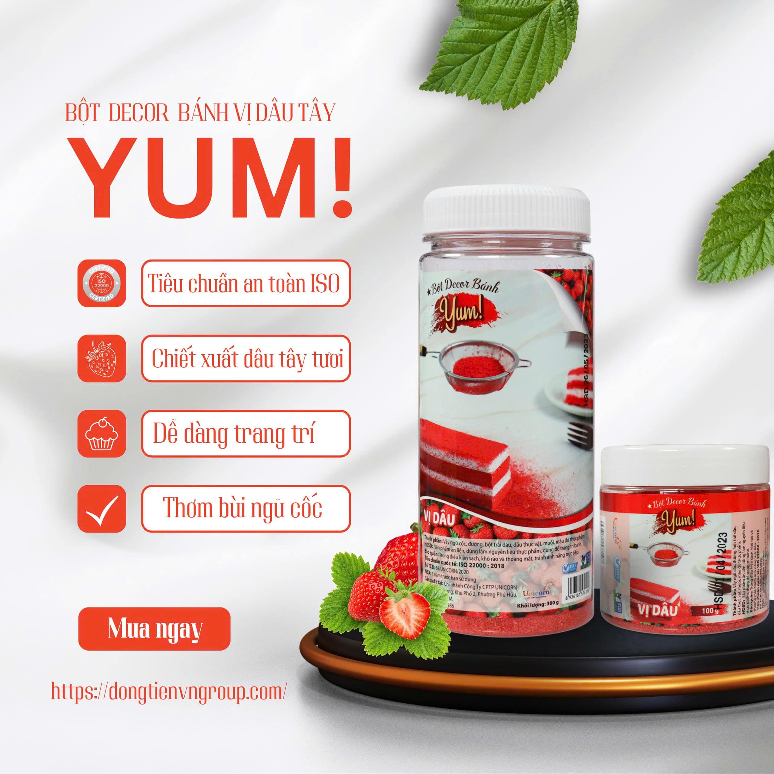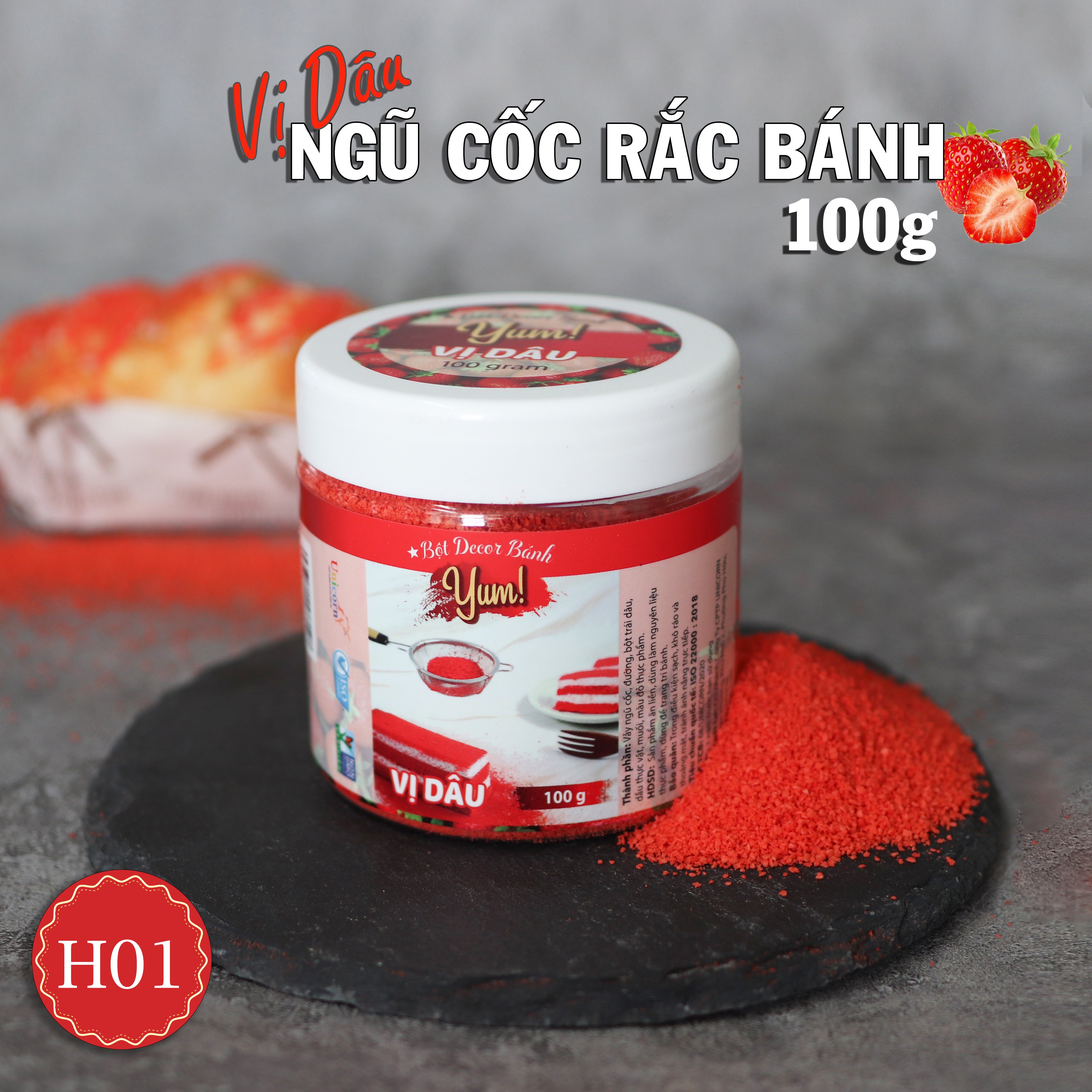 Ngũ Cốc Bột Yum! là một loại bột rắc trang trí bánh làm từ ngũ cốc nguyên hạt và hương vị dâu tây tự nhiên. Sản phẩm được chế biến thành dạng bột mịn, dễ rắc lên bề mặt bánh kem, cupcake, donut, pancake hoặc các món tráng miệng khác.