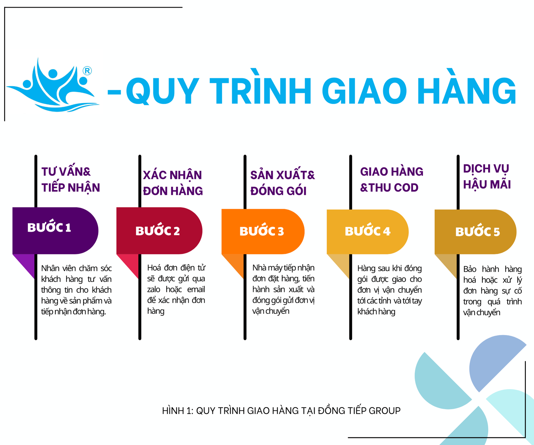 Quy trình giao hàng tại công ty áp dụng với tất cả các đơn hàng (bao gồm cả đơn hàng lẻ và đơn sỉ) trải qua 5 bước gồm: