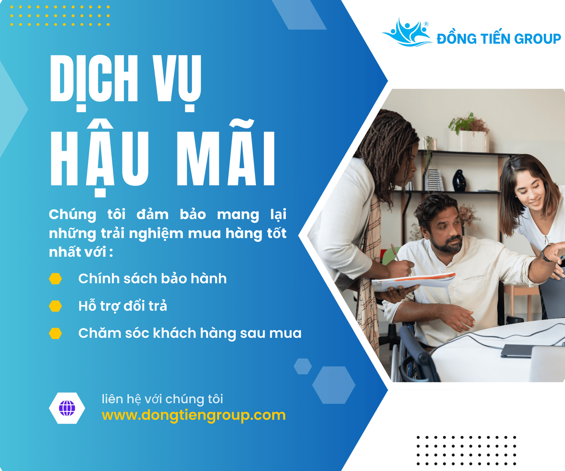 Đồng Tiến Group luôn đặt khách hàng làm trung tâm và cung cấp các dịch vụ hậu mãi nhằm nâng cao trải nghiệm mua sắm, bao gồm: